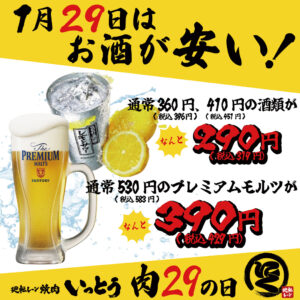 《1/29(木) 1日限り!》『いっとう肉の日』は、お酒が安い!
