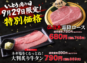 お知らせ《9/29(月) 1日限り!》「大判炙り牛タン」「仙台牛霜降りロース」がお得に楽しめる!!/『いっとう肉の日』9/29は、お酒が安い!