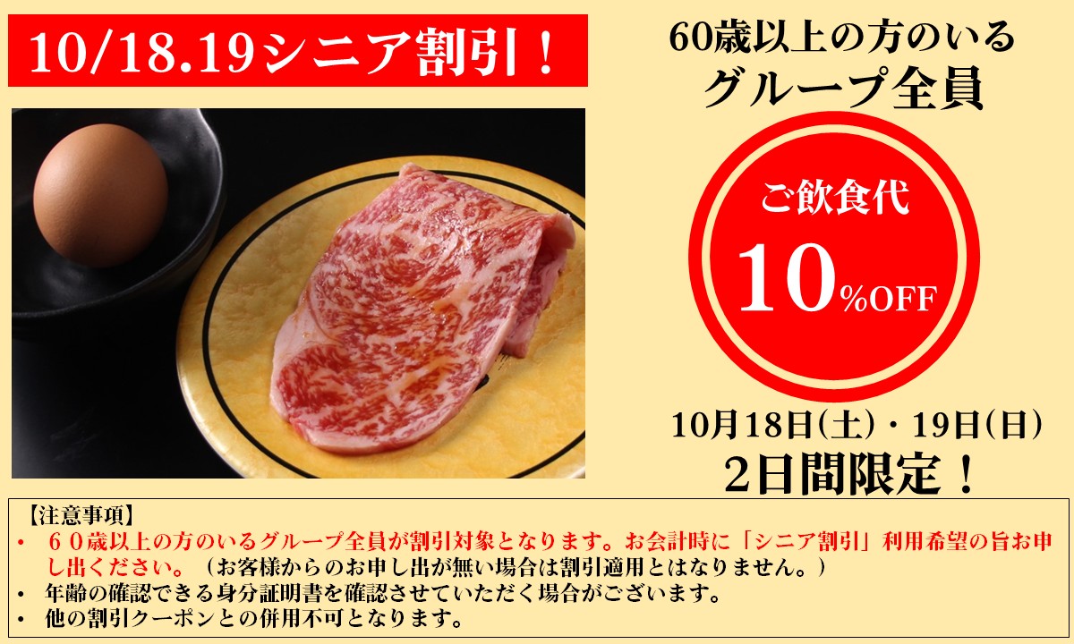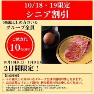 お知らせ《10/18(土)~10/19(日)》”スペシャル企画「シルバー割引」”60歳以上の方のいるグループ全員ご飲食代10%OFF
