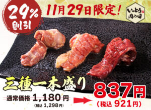 《11/29(土) 1日限り!》冬の新作「三種一本盛り」が29%OFF!!/『いっとう肉の日』11/29は、お酒が安い!