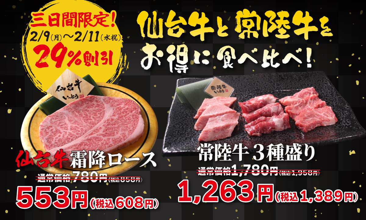 《2/9(月)~2/11(水・祝)三日間限定》”仙台牛霜降りロース”と”常陸牛3種盛り”が29%OFF!