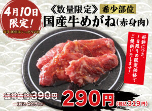 《4/10一日限り!》希少部位!国産牛めがね”が290円(税込319円)!人気メニューをお試しください!《数量限定》