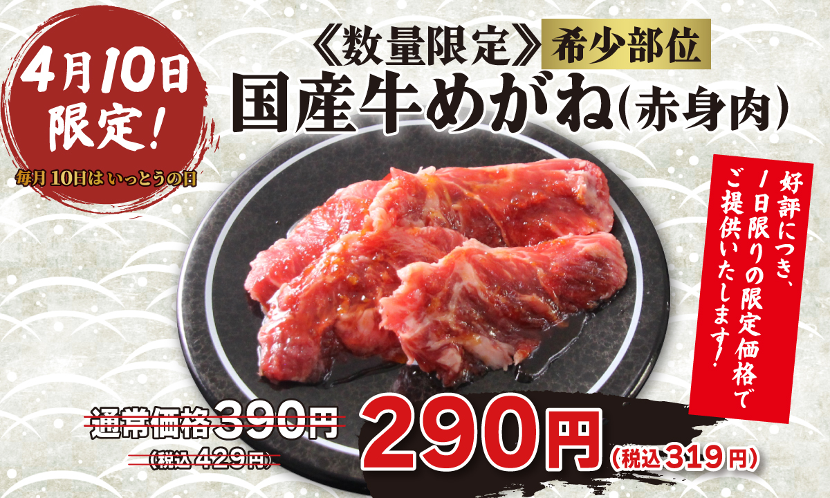 赤身肉のおいしさを堪能できる”国産牛めがね”が、4/10(金)限定、特別価格290円(税込319円)で楽しめます!数量限定のため、お早めにどうぞ!人気メニューを是非お試しください。 国産牛めがね【希少部位】《4/10限定 […] -