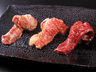 3種の肉で大満足!牛ハラミ、豚ハラミ、牛カルビを香ばしいタレで焼き上げる!ガッツリ派におすすめの一皿です。
