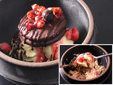 キンキンに冷やした石鍋で、具材をクラッシュしながら混ぜるのが一番美味しい食べ方です!自分で完成させる体験型スイーツ♪