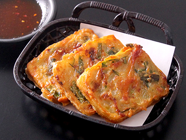 外はカリッと、中はもちもちの海鮮チヂミに、当店オリジナルブレンドの特製だれを添えました。タレまで楽しめる、こだわりの一品です。