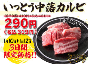 《1/10(土)~1/12(月・祝)三日間限定》「いっとう中落ちカルビ」290円…